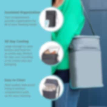 JL Childress Six Bottle Cooler Bag Grey ir praktiska un stilīga aukstuma soma, kas radīta, lai ceļā vienmēr būtu ērti paņemt līdzi bērnu pudelītes vai pārtiku. MaxiCool somas ietilpība ļauj ievietot līdz sešām standarta izmēra zīdaiņu pudelītēm vai līdzvērtīga tilpuma pārtikas kārbiņām. Pateicoties komplektā iekļautajam netoksiskajam dzesēšanas iepakojumam, ēdiens un dzērieni saglabājas svaigi un atdzesēti līdz pat 8 stundām (mērenā temperatūrā). Somai ir hermētiska, izņemama iekšpuse, kas ievērojami atvieglo kopšanu, kā arī tā nesatur PVC, ftalātus un svinu – droša izvēle bērna ikdienai. Vieglā konstrukcija un kompaktais izmērs padara šo aukstuma somu ideāli piemērotu ceļošanai, pastaigām, iepirkšanās braucieniem vai lietošanai automašīnā.