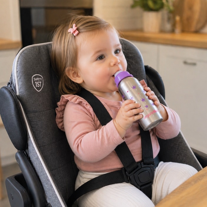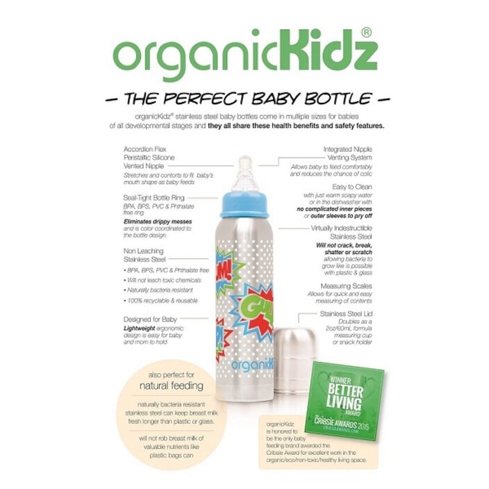 Izturīga, praktiska un stilīga bērnu pudelīte ar termo funkciju no nerūsējošā tērauda, kas uztur dzērienu karstu vai aukstu līdz pat 6 stundām. OrganicKidz Thermal Baby Bottle Posh ir ideāla izvēle vecākiem, kas meklē drošu, funkcionālu un videi draudzīgu alternatīvu plastmasas un alumīnija pudelēm. Pudelīte nesatur PVC, bisfenolu A (BPA) un ftalātus, nodrošinot pilnīgu drošību jūsu mazulim. Šī termo bērnu pudelīte ir ne tikai praktiska, bet arī viegli lietojama ikdienā – gan mājās, gan ceļojumos vai dabā. Tā apvieno modernu dizainu ar augstu funkcionalitāti: vāciņa veidots mērtrauks ļauj precīzi dozēt dzērienu, bet standarta izmēra mīkstais silikona uzgalis padara dzeršanu ērtu un drošu. Nerūsējošais tērauds neietekmē dzēriena garšu, un pudele ir apstiprināta lietošanai pārtikā.