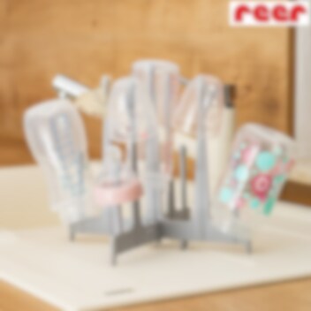 Reer Drying Stand ir gudrs salokāms bērnu pudelīšu žāvēšanas statīvs, kas ir praktiski lietojams gan mājās, gan atrodoties prom no mājām, piemēram, ceļojot. Higiēnisks un vienkāršs veids, kā žāvēt izmazgātas bērnu pudelītes, knupīšus, krūzītes un citus bērnu pārtikas piederumus. Žāvēšanas statīvā ir deviņi zari pudelēm un krūzēm un vairāki mazāki āķīši, piemēram, knupjiem. Reer žāvēšanas plaukts ir salokāms, tāpēc to var ievietot trauku mazgājamā mašīnā un, ja nepieciešams, glabāt virtuves atvilktnē vai bagāžā. Produkts ir izgatavots no materiāliem, kas nesatur PVC, BPA un ftalātus.