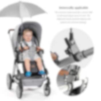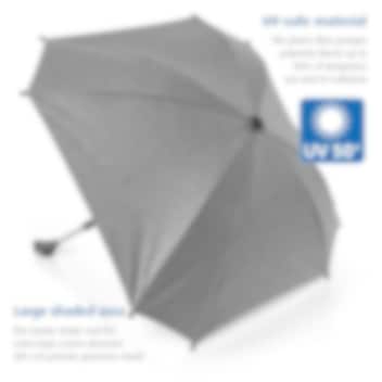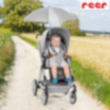 Reer ShineSafe Grey Pram Parasol ir universāls saulessargs, kas piemērots lielākajai daļai bērnu ratiņu un ratiņu modeļu. Saulessargs nodrošina UV aizsardzību UPF 50+ un ir viegli piestiprināms pie ratiņiem ar spriegošanas siksnu, ļaujot to ātri noņemt un uzglabāt zem ratiņiem, kad tas netiek lietots. Saulessargu ir vienkārši pielāgot saules virzienam, lai nodrošinātu optimālu aizsardzību bērnam. Pateicoties viedajam kronšteinam, saulessargs var tikt izmantots arī alternatīvās vietās, piemēram, uz ceļojumu gultiņas, bērnu sporta zālē vai barošanas krēslā, kad bērns tiek barots ārā.