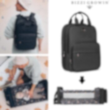 Bizzi Growin RucPOD Windsor Black ir unikāla un gudra autiņbiksīšu soma, kuru viegli pārveidot par ceļojumu gultiņu mazulim. Tā ir ideāli piemērota gan ceļojumiem, gan ārpus mājas, kad mazulim nepieciešams gulēt. Integrētā ceļojumu gultiņa salokās dažu minūšu laikā un ir aprīkota ar polsterētu matraci, ko var izmantot arī kā pārtinamo paliktni, kā arī ar smalku acs moskītu tīklu. Autiņbiksīšu somu var nēsāt kā mugursomu ar polsterētām un regulējamām plecu siksnām vai piestiprināt pie ratiem, izmantojot komplektā iekļautās stiprinājuma siksnas. Soma piedāvā ietilpīgu galveno nodalījumu, kurā viegli ietilpst autiņbiksītes, mitrās salvetes, pārģērbšanās drēbes un bērnu pārtika. Priekšpusē ir divas mazākas kabatas, sānos – divi pudeļu turētāji. Materiāls ir izturīgs un viegli kopjams, savukārt produkts ir pārbaudīts un atbilst drošības standartam BS EN 1466:20149, nodrošinot, ka mazulim gulēt tajā ir droši.