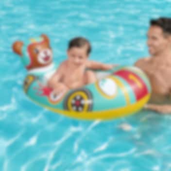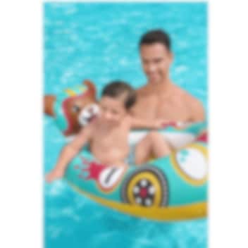 Piepūšamā bērnu laiva saulainām un priecīgām dienām baseinā, kas izgatavota jaukā dizainā ar delfīniem. Bestway Splash Buddy Baby Boat piepūšamā laiva ir 109 x 69 cm, tai ir drošības vārsti un savilkšanas aukla priekšpusē. Laiva ir izgatavota no izturīga materiāla un paredzēta bērniem no aptuveni 3 gadu vecuma.