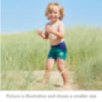 SplashAbout Splash Jammers Jade peldbikses ar autiņbiksīšu funkciju ir praktisks un drošs risinājums nedaudz vecākiem bērniem peldēšanas laikā. Šīs peldbikses ir izgatavotas no blīva un elastīga neoprēna, kas nodrošina komfortu un drošu piegulšanu gan baseinā, gan atpūšoties pie jūras. Peldbiksēm ir stingra jostasvieta un cieši pieguļošas malas ap augšstilbiem, kas efektīvi novērš neērtas un nehigiēniskas noplūdes. Tādēļ Splash Jammers peldbikses ir lieliski piemērotas peldēšanas nodarbībām, ūdens spēlēm vai brīvdienu ceļojumiem. Mīkstais un elastīgais materiāls nodrošina, ka peldbikses ir ērti valkājamas pat tad, ja tās ir slapjas. Peldbikses ātri izžūst un sniedz saules aizsardzību UPF 50+, kas padara tās par drošu izvēli arī ārā pavadītām dienām.