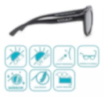 Koolsun Air Beluga Black bērnu saulesbrilles apvieno mūsdienīgu dizainu ar maksimālu drošību un komfortu. Aviatora formas rāmis no izturīga TPE materiāla ir elastīgs un triecienizturīgs, tāpēc brilles ir piemērotas ikdienas valkāšanai gan mazākiem, gan aktīvākiem bērniem. Spoguļlēcas ar Revo tehnoloģiju ir izgatavotas no neplīstoša polikarbonāta, kas nodrošina 100 % UV-A un UV-B aizsardzību un augstu izturību pret skrāpējumiem. Tā kā UV filtrs atrodas lēcu iekšpusē, aizsardzība saglabājas pat gadījumā, ja uz virsmas parādās skrāpējumi. Komplektā iekļauts praktisks mikrošķiedras maisiņš, kas paredzēts brillēm drošai uzglabāšanai un tīrīšanai.