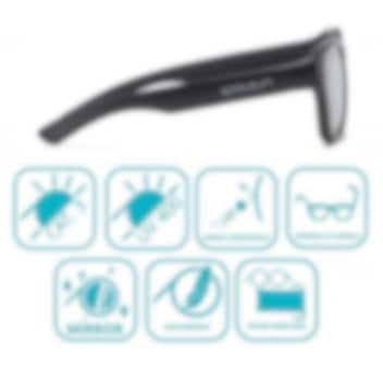 Koolsun Aspen Black saulesbrilles bērniem apvieno modernu un stilīgu dizainu ar augstu komfortu un uzticamu aizsardzību. Šis elegantais modelis vienlīdz labi piestāv gan meitenēm, gan zēniem un ir lieliski piemērots aktīviem bērniem, kuriem patīk pavadīt laiku saulē. Brilles rāmis un kājiņas ir izgatavotas no elastīgas un izturīgas TPE plastmasas, kas nodrošina gan izturību, gan ērtu valkāšanu. Nedrūstošās spoguļlēcas no polikarbonāta efektīvi aizsargā pret spilgtu saules gaismu un ir aprīkotas ar UV-400 aizsardzību (CE 3. kategorija), kas filtrē 100 % gan UVA, gan UVB starojuma. UV filtrs ir iestrādāts pašās lēcās, nevis uzklāts uz virsmas. Tas nozīmē, ka bērna acis joprojām ir aizsargātas pat tad, ja lēcas tiek saskrāpētas. Saulesbrilles tiek piegādātas ar praktisku mikrošķiedras maisiņu, ko var izmantot gan uzglabāšanai, gan lēcu tīrīšanai.