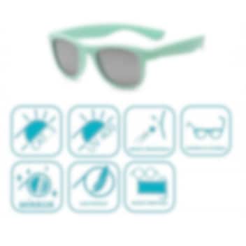 Koolsun Wave Bleached Aqua bērnu saulesbrilles apvieno stilīgu dizainu ar maksimālu drošību un izturību. Triecienizturīgais rāmis un elastīgās kājiņas no TPE materiāla nodrošina lielisku pielāgošanos un ērtu valkāšanu aktīviem bērniem. Lēcas izgatavotas no neplīstoša polikarbonāta ar Revo spoguļu tehnoloģiju, kas piešķir modernu izskatu un vienlaikus nodrošina augstu aizsardzību pret skrāpējumiem. Brilles piedāvā 100 % UV-A un UV-B aizsardzību. Komplektā ietilpst praktisks mikrošķiedras maisiņš, kas noder gan brillēm drošai uzglabāšanai, gan tīrīšanai.