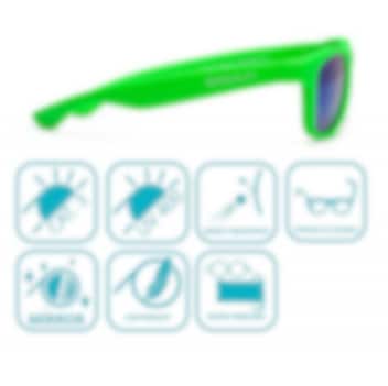 Koolsun Wave Neon Green bērnu saulesbrilles apvieno stilīgu dizainu ar maksimālu drošību un izturību. Triecienizturīgais rāmis un elastīgās kājiņas no TPE materiāla nodrošina lielisku pielāgošanos un ērtu valkāšanu aktīviem bērniem. Lēcas izgatavotas no neplīstoša polikarbonāta ar Revo spoguļu tehnoloģiju, kas piešķir modernu izskatu un vienlaikus nodrošina augstu aizsardzību pret skrāpējumiem. Brilles piedāvā 100 % UV-A un UV-B aizsardzību. Komplektā ietilpst praktisks mikrošķiedras maisiņš, kas noder gan brillēm drošai uzglabāšanai, gan tīrīšanai.
