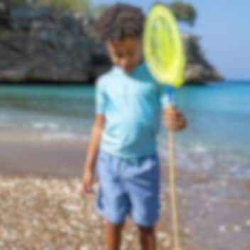 Playshoes Shark Turquoise ir jauks un aizsargājošs UV peldkostīmu komplekts bērniem, kas sastāv no krekla ar īsām piedurknēm un peldbiksēm. Komplektam ir UV aizsardzības koeficients 80, kas nodrošina augstu aizsardzību pret saules kaitīgajiem stariem. Krekls ir aprīkots ar praktisku kakla apkakli papildu drošībai. Apģērbs izgatavots no mīksta un elastīga materiāla (82% poliesters, 18% elastāns), kas ir sertificēts atbilstoši UV standartam 801 un Oeko-Tex Standard 100. Tas ir viegli uzvelkams un novelkams, ērts pat tad, kad audums ir slapjš, un ātri izžūst pēc lietošanas.