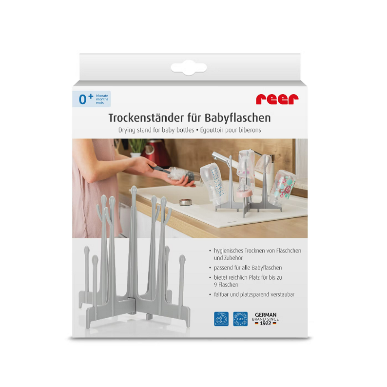 Reer Drying Stand ir gudrs salokāms bērnu pudelīšu žāvēšanas statīvs, kas ir praktiski lietojams gan mājās, gan atrodoties prom no mājām, piemēram, ceļojot. Higiēnisks un vienkāršs veids, kā žāvēt izmazgātas bērnu pudelītes, knupīšus, krūzītes un citus bērnu pārtikas piederumus. Žāvēšanas statīvā ir deviņi zari pudelēm un krūzēm un vairāki mazāki āķīši, piemēram, knupjiem. Reer žāvēšanas plaukts ir salokāms, tāpēc to var ievietot trauku mazgājamā mašīnā un, ja nepieciešams, glabāt virtuves atvilktnē vai bagāžā. Produkts ir izgatavots no materiāliem, kas nesatur PVC, BPA un ftalātus.